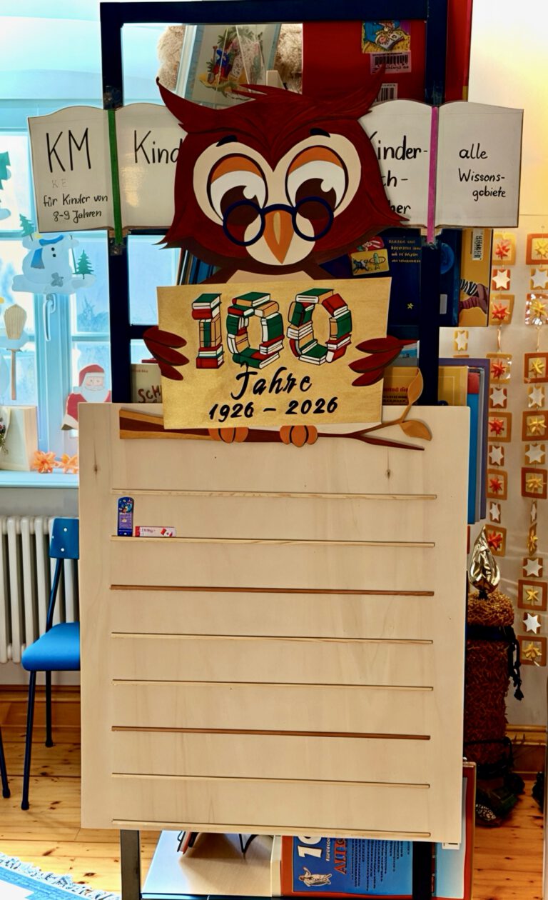 Unsere Büchereieule hat eine große Aufgabe: Bis zur Jubiläumsfeier sollen mindestens 100 Bücher ihr Regal füllen! Alle Kinder dürfen mithelfen und ein Buch mit ihrem Namen gestalten.